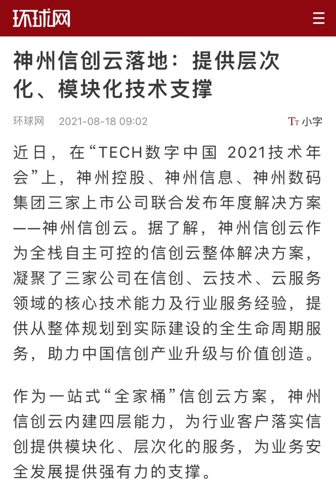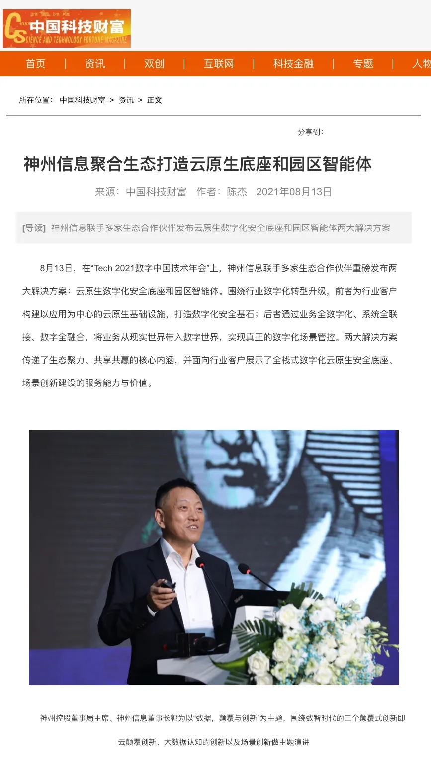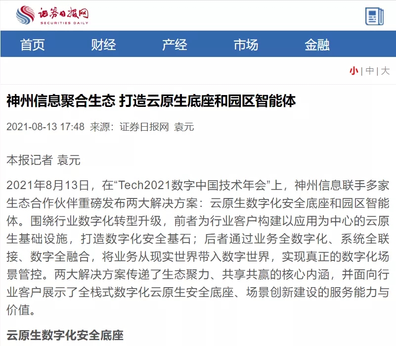 8月12日,由神州控股、神州信息、东升国际集团联合主办的“科技自强、数据融通、场景创新——TECH数字中国 2021技术年会”云上盛大启幕,发布神州信创云、ModelB@nk5.0、金融超脑Sm@rtFSB、云原生数字化安全底座、园区智能体等重磅产品,国内各大权威、影响力媒体多角度多频次对盛况进行报道!